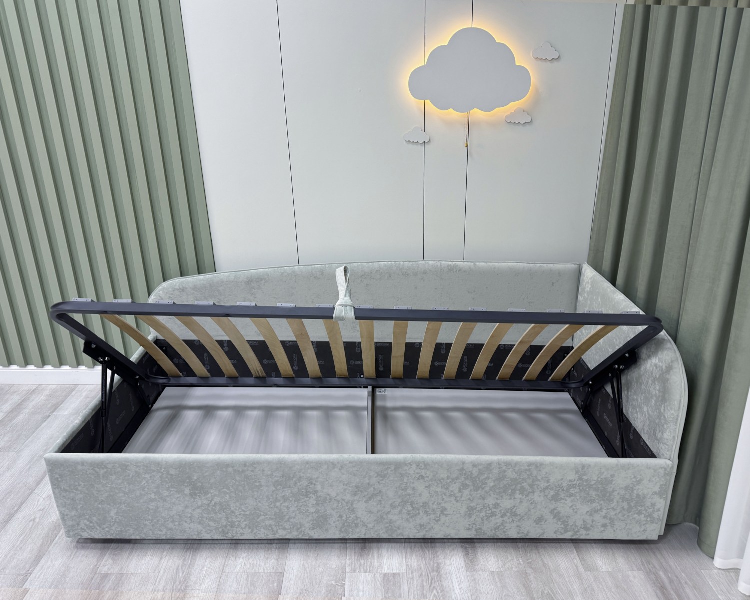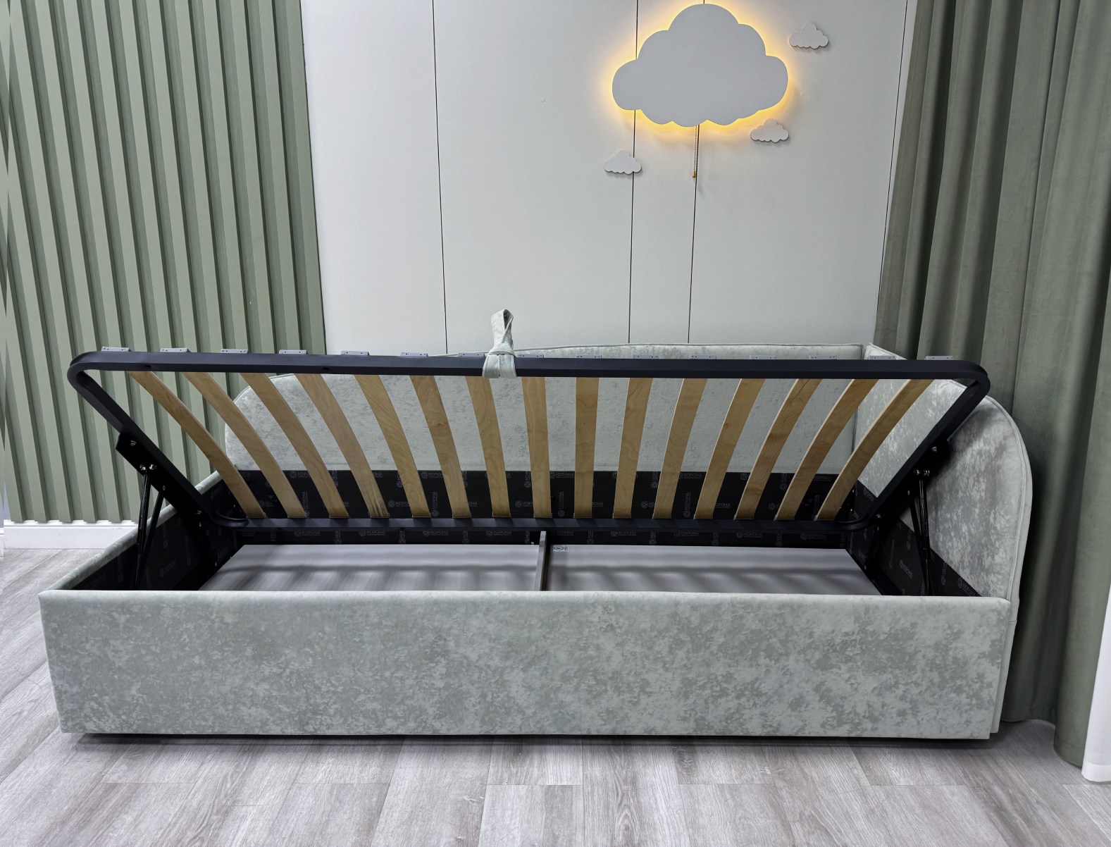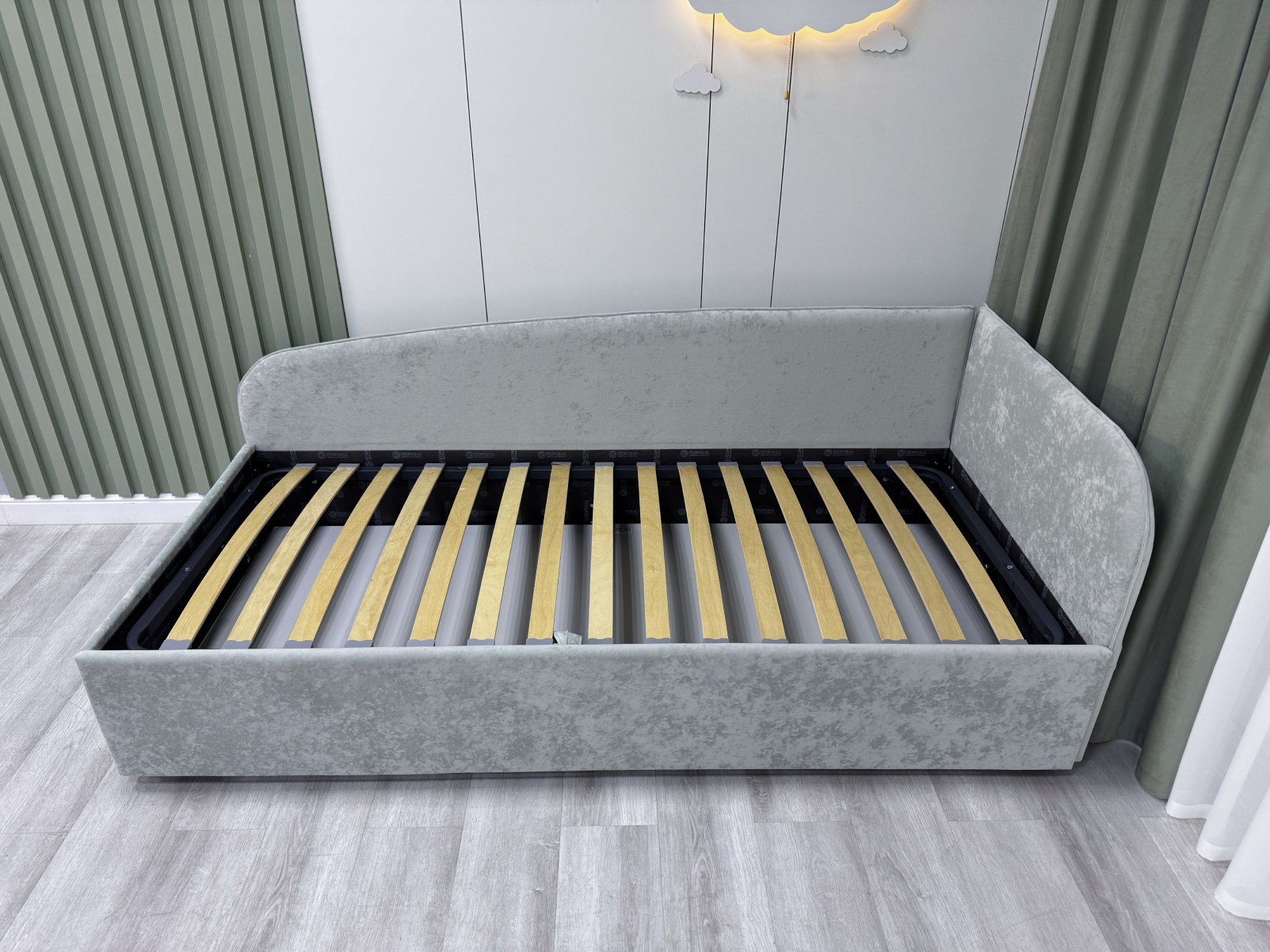 Обратите внимание, что кровать в базовой комплектации идет с логотипированной универсальной спинкой.