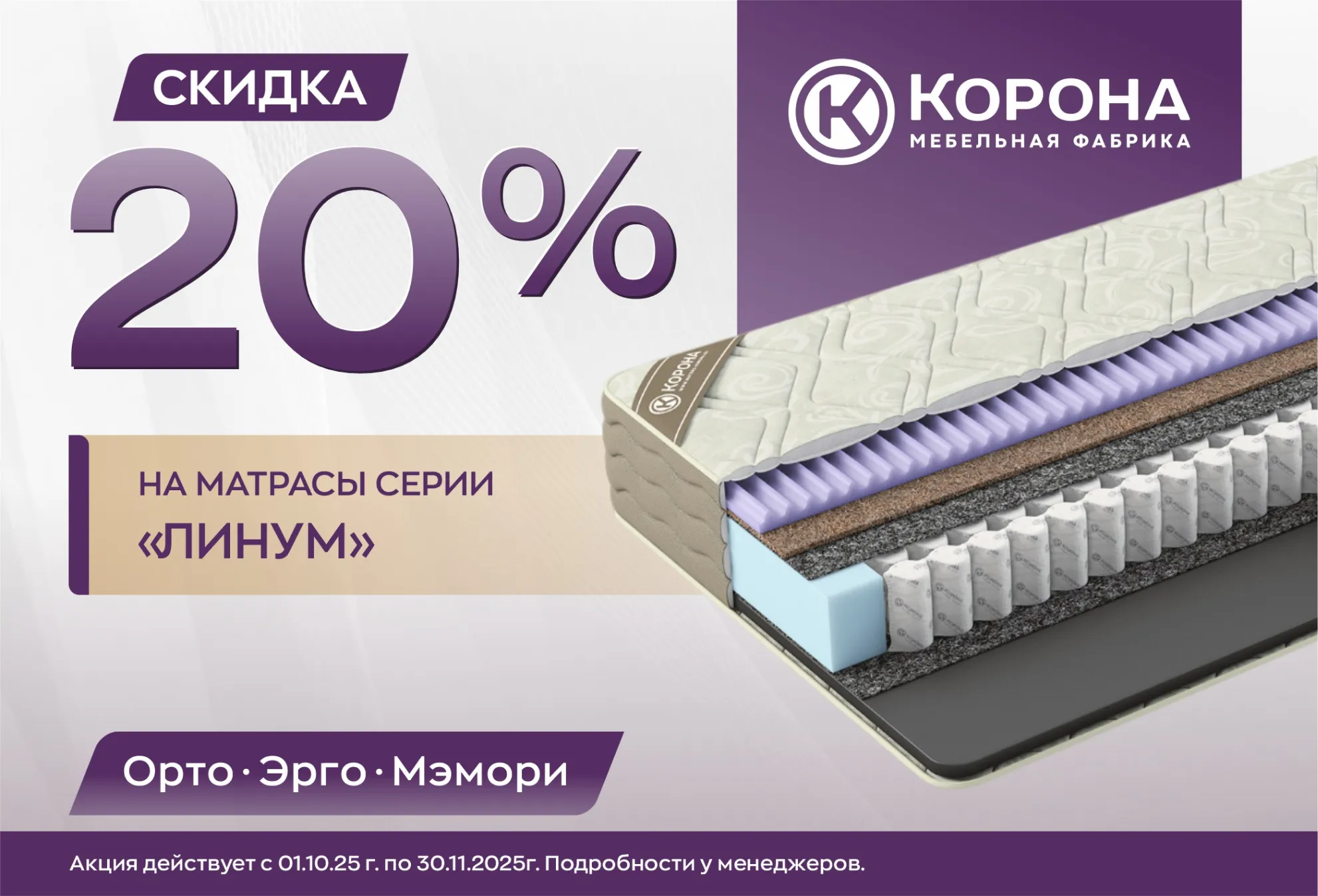Спешим сообщить о старте выгодного предложения! Только до 31 мая 2026 года на все матрасы серии «Линум»: «Мемори», «Орто» и «Эрго» действует скидка 20%.